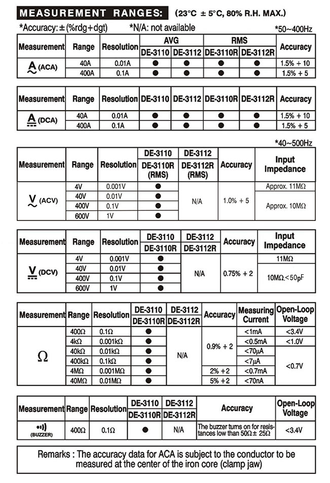 Measurement RangeACA : 40A - 400A DCA : 40A - 400A ACV : 4V - 600V DCV : 4V - 600V Resitance : 400Ω - 40MΩ Buzzer : 400Ω
