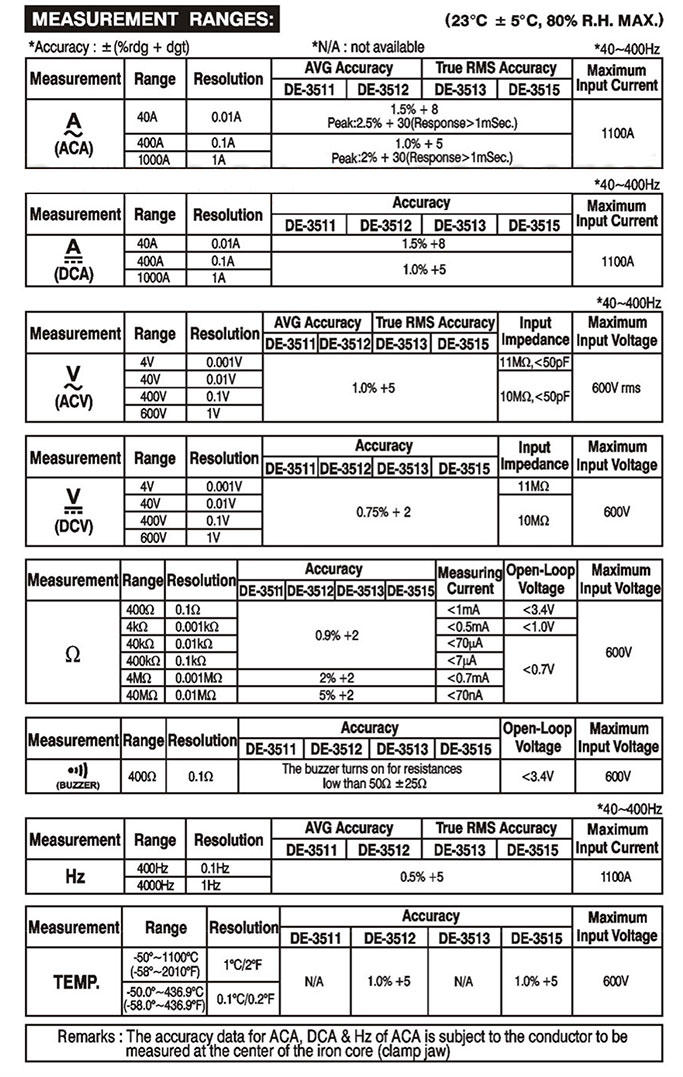Measurement RangeACA : 40A - 1000A DCA : 40A - 1000A ACV : 4V - 600V DCV : 4V - 600V Resitance : 400Ω - 40MΩ Buzzer : 400Ω Ferquency: 400Hz - 4000 Hz