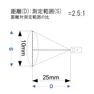 • หากยื่นห่างจากจุดที่จ้องการวัดอุณหภูมิออกมา 25 mm ขนาดพื้นที่ที่วัดอุณหภูมิคือ 10 mm (มิลลิเมตร)