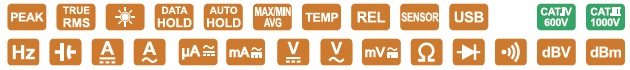 ฟังก์ชั่นการวัด DCV, ACV, DCmV Sensor, ACmV sensor, Clamp Sensor, ohms, DCA, ACA, Capacitor, Hz, Temperature, Continuity check, Diode,dBV/dBm