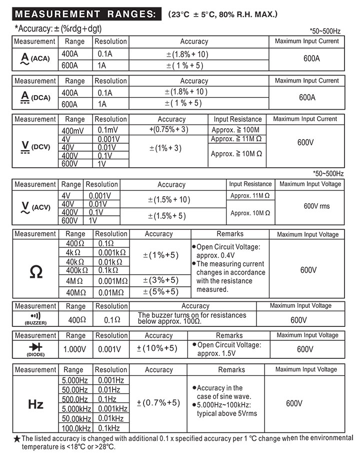 Measurement RangeACA : 400A - 600A DCA : 400A - 600A DCV : 400mV - 600V ACV : 4V - 600V Resitance : 400Ω - 40MΩ Buzzer : 400Ω Diode : 1.000V ferquency : 5.000Hz - 100.0kHz