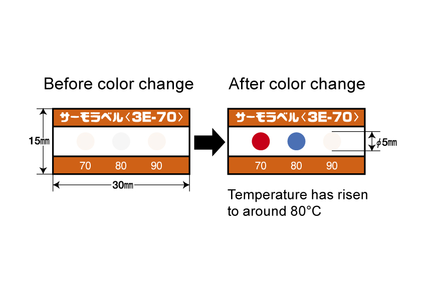 3E-45 การรวมกันของจุดตรวจวัดสามจุดในช่วงเวลา 10°C ด้วยขนาด ø5 mm จะติดอยู่บนฉลากเดียวเพื่อตรวจสอบอุณหภูมิเกณฑ์ที่แตกต่างกัน 3 แบบ 45 55 65  ถูกพิมพ์บนฉลากแบบใช้ครั้งเดียวเพื่อตรวจสอบการรวมกันของอุณหภูมิเกณฑ์ที่แตกต่างกันสามแบบ แต่ละตัวจะเปลี่ยนสีเมื่อถึงอุณหภูมิที่ตั้งไว้ ประเภทนี้ใช้สำหรับการใช้งานที่หลากหลายสำหรับการตรวจสอบอุณหภูมิภายในและภายนอกอาคาร บริษัทพลังงานสามารถใช้เพื่อตรวจสอบอุปกรณ์ส่งกำลังและควบคุมอุณหภูมิของเครื่องจักร เพื่อป้องกันอุบัติเหตุและเพิ่มประสิทธิภาพการควบคุมความปลอดภัย