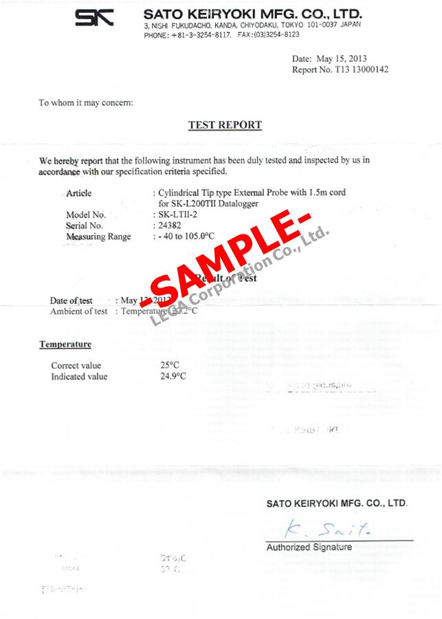 ตัวอย่าง: การต่อโพรบเข้ากับตัวเครื่อง (รูปที่แสดง SK-L200TII + SK-LTII-1) ตัวอย่าง: Test Report จากโรงงาน